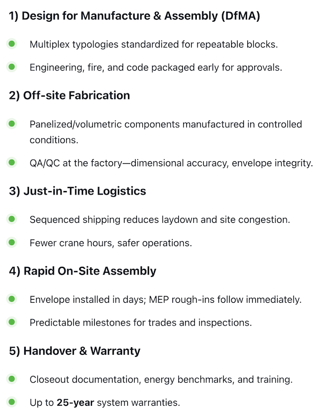 We deliver engineered prefab housing across Ontario – from GTA laneway homes to multi-unit and subdivision projects – using a structured pre-application planning process for predictable results.